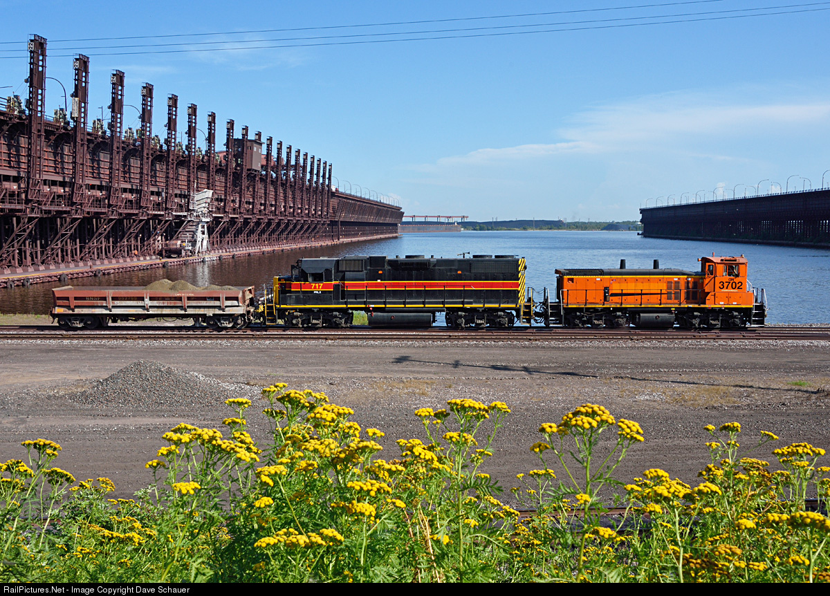 Renumbered GN 3702, this former Frisco switcher leads a short transfer past CN's ore dock in Duluth.