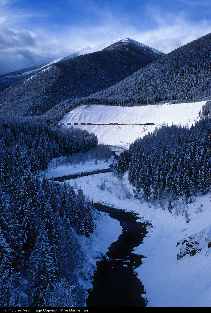 After a overnight snowfall of over a foot, Burlington Northern Santa Fe stack train No. 15 is at Java West on Montana’s Marias Pass on March 2, 1997. An icy Middle Fork of the Flathead River meanders through the winter scape.