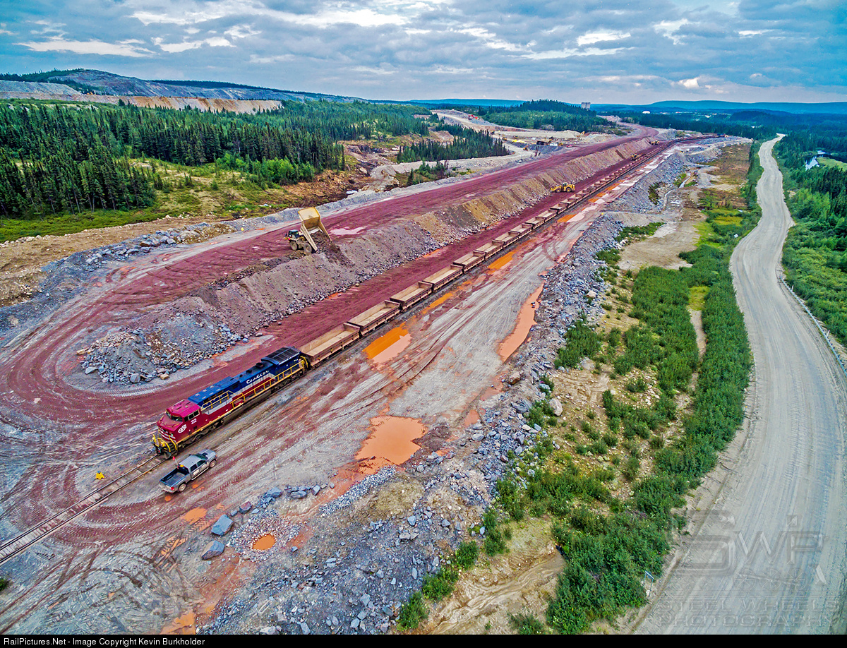 The empty Fire Lake ore train - utilizing side dump cars - is seen having just arrived at the stub end track at the mine site with the QCM AC44CW #11 way off in the distance on the south end and the AC44CW #22 present to lead the loads north once the 1 and a quarter (or so) loading process is completed. I have multiple photos from this location but chose this one as the dump truck is visible in the foreground dumping raw ore as the tractors begin to dig in and load the train. The crew truck in the foreground is used to shuttle the crew back and forth between ends of the train. As info - the open-pit mine at Fire Lake is currently being worked because of the high demand for iron ore products. The mine operates solely between May and October, when the ground thaws. The Fire Lake mine site has neither a crusher nor a concentrator, though the extraction sequence is the same as at Mont-Wright (further north). All crude ore from Fire Lake is transported to Mont-Wright by train, over the rail link that connects Fire Lake to the main railway line. At Mont-Wright, the ore is carried to the crusher and broken up into fragments some 20 centimetres in diameter. The fragmented ore is then carried to the concentrator, where it is goes through the regular concentration process.