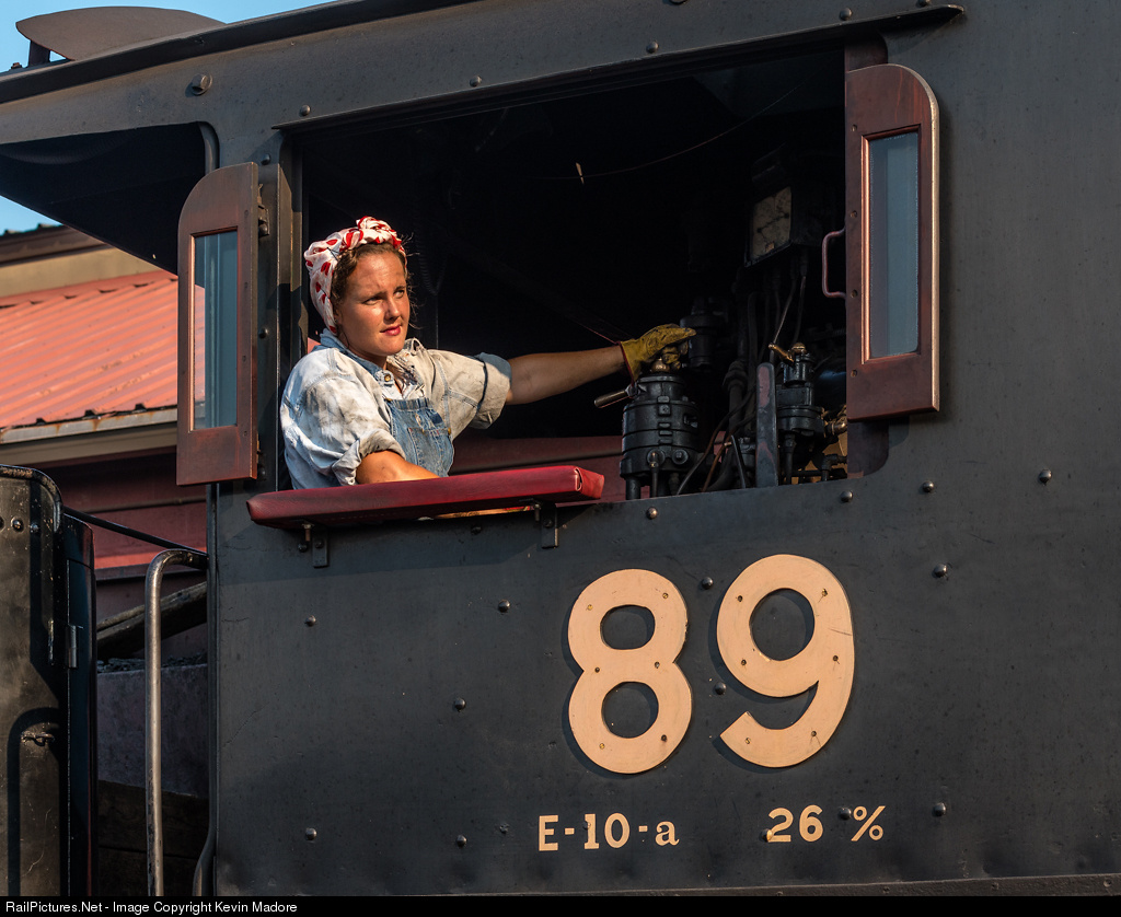 Sparkee in her office. Although she's posing for the cameras this day as "Rosie the Riveter", Strasburg Rail Road employee Andrea B. is actually right at home in the cab of Strasburg's Canadian National Mogul #89. As with most Strasburg shop employees, she's fully qualified to run this engine in tourist service, and you will see her out on the line.