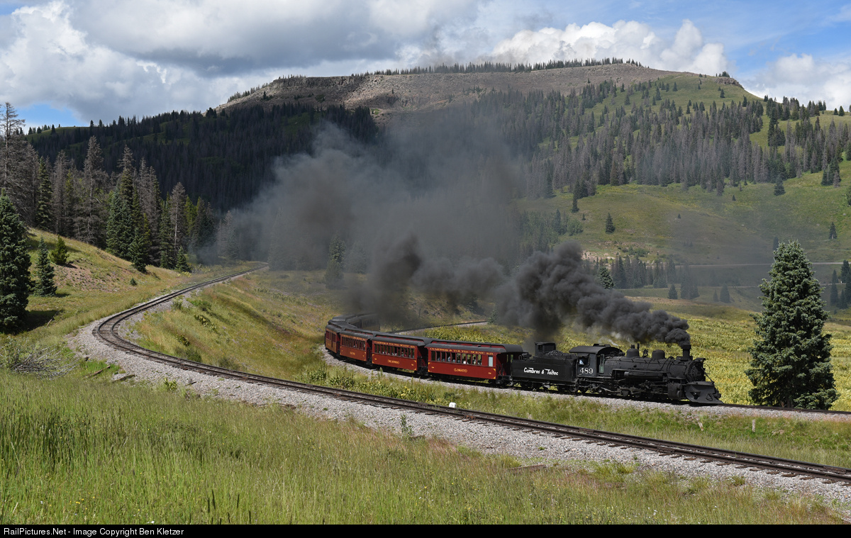 Cumbres and Toltec Scenic Railroad #489 smokes as it pulls into Tanglefoot Curve. Soon this train will traverse the track in the foreground as it surmounts the final grade into Cumbres. In the background, you can see another level of track, that the train has already climb through on it's way up the east slope of Cumbres Pass.