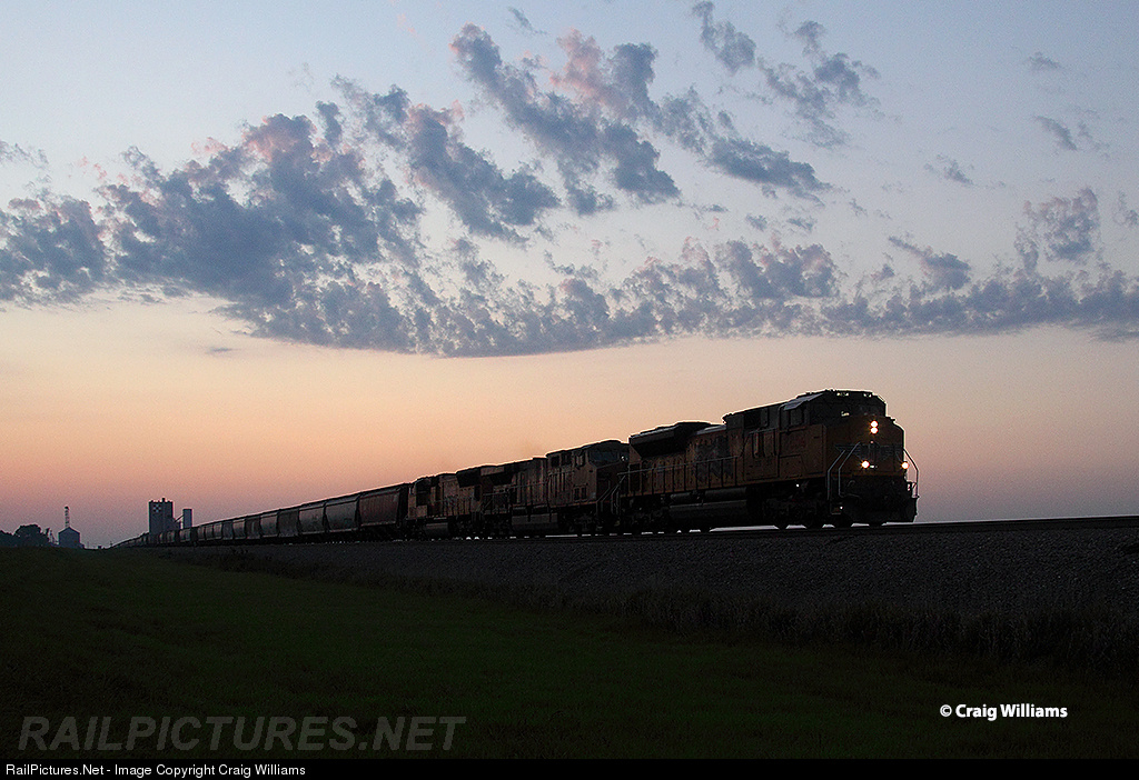 A loaded grain train bound for Clinton, IA, passes thru the small town of Clarence minutes after sunset. The train is traveling along highway 30, around 45 miles from Clinton.