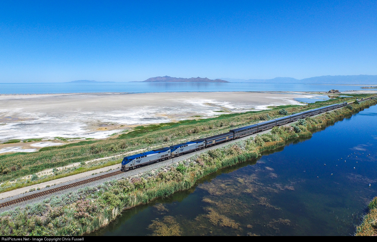 Both westbound and eastbound California Zephyr trains typically meet on or near the Salt Flats during the midnight hour. This 12-hour late train departed from Salt Lake City about twenty minutes earlier, and began cresting along the Great Salt Lake bound for Nevada and California.