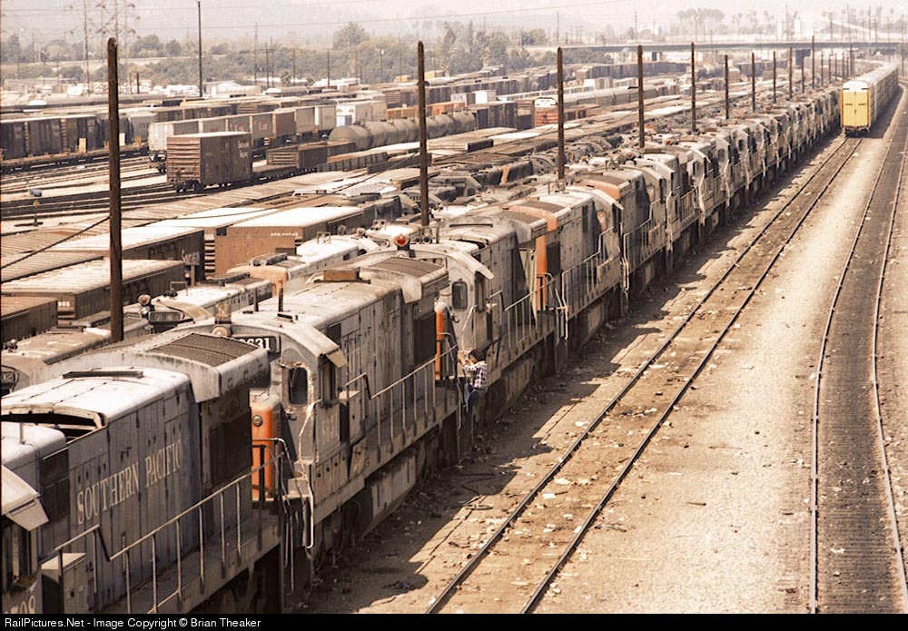 | Another view of dozens of unused locomotives sitting at Taylor Yard. In the center of the photo, someone is climbing up on one of the locomotives. I'm not sure if he is supposed to be there. |