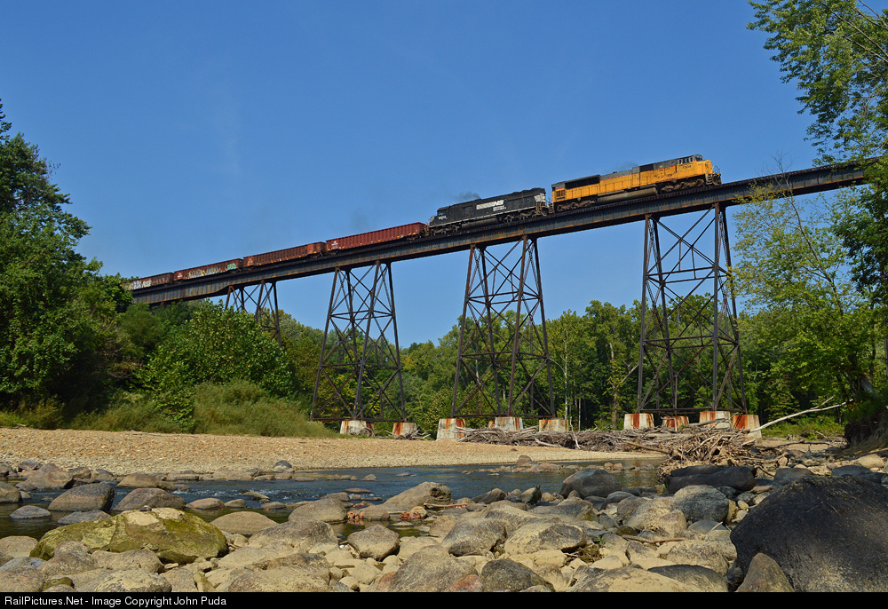 Bellevue Ohio to Elmira New York freight train 310 roars over the Grand River in Painesville on a hot and humid morning.