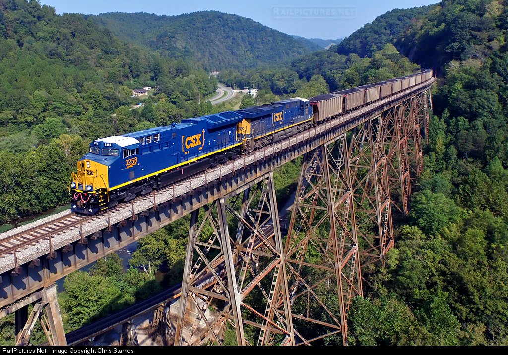 Brand new CSX GE ET44AH #3258 leads a southbound loaded SCWX coal train across the Copper Creek Viaduct enroute to Erwin, TN and points south. The engine was released from GE Erie less than a week prior and is making its first cycle in revenue service.