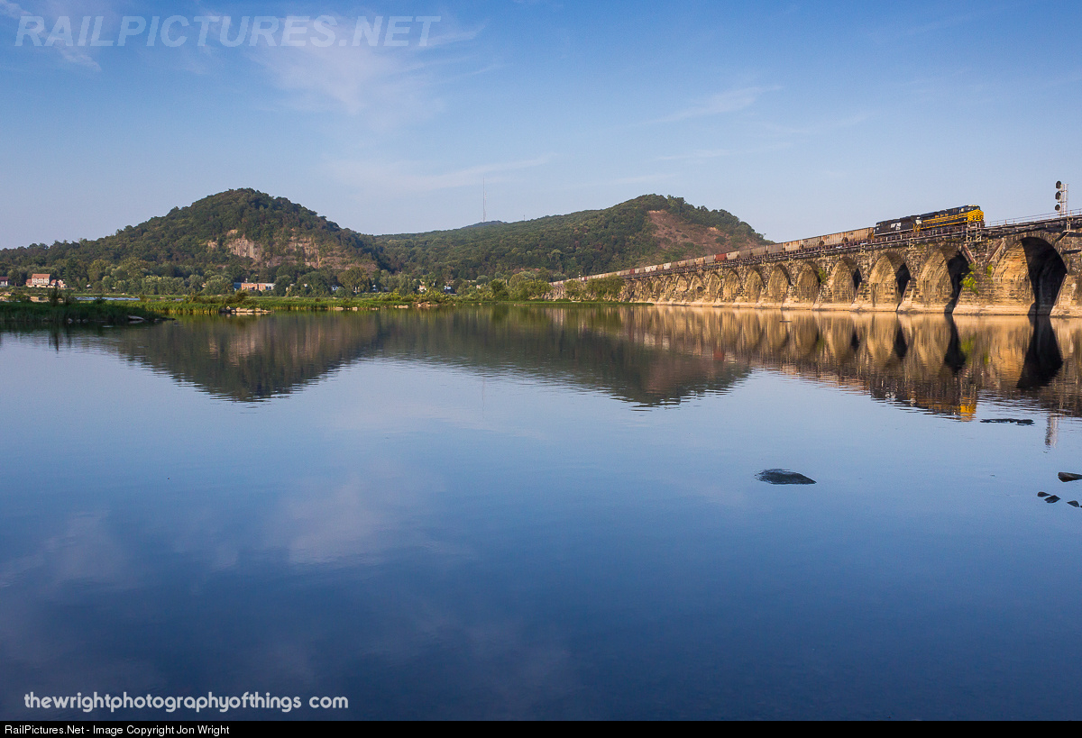 747 with NS Heritage 8100 the Nickel Plate leads empty hoppers across the Susie Q north of Harrisburg on its way back to the mines of Western Pennsylvania. The famous stone bridge is named after the hamlet of 4ockville, seen on the opposite bank of the river. For this and other photos please visit my site at thewrightphotographyofthings.com