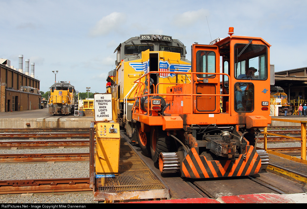 Union Pacific EMD SD70ACe No. 8576 rides the north transfer table behind a Rail King RK 300 mobile railcar mover (trackmobile) at North Little Rock’s Jenks Shop on May 18, 2015.