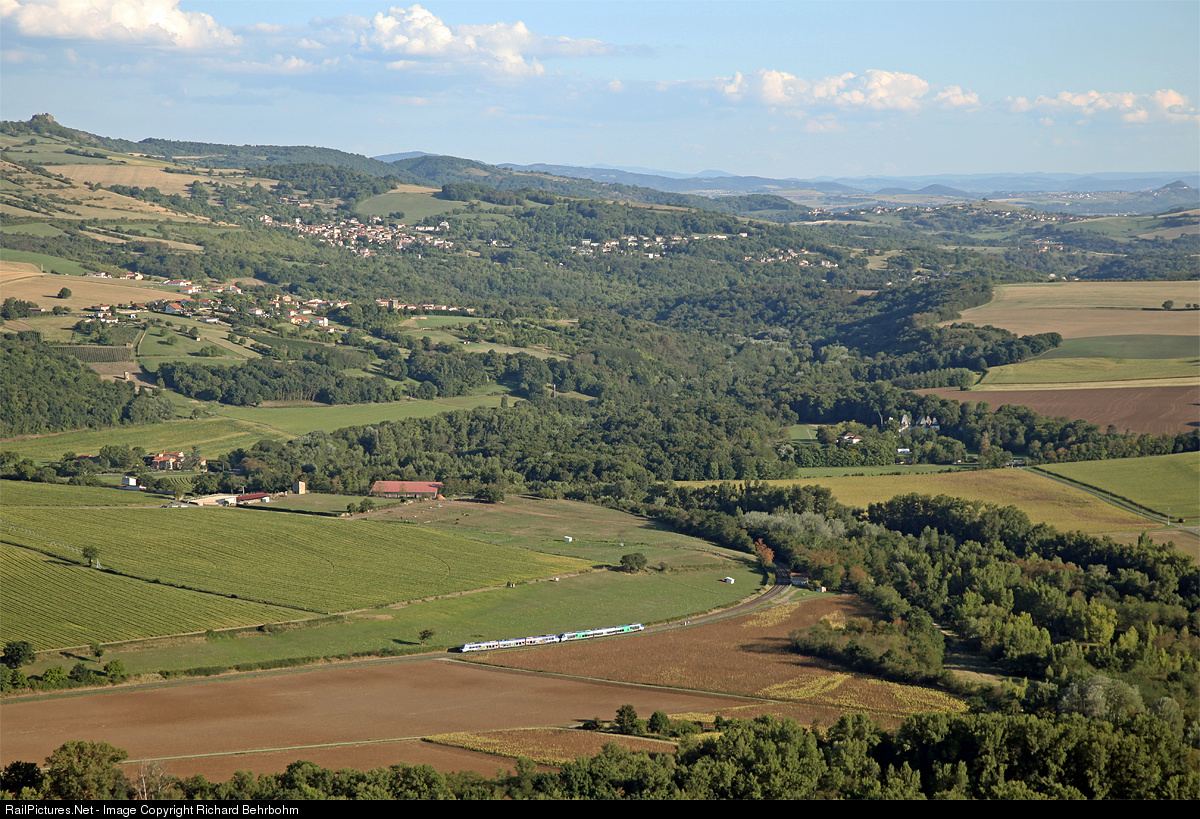From a lookout in Corent, you a have a nice view in the French Department Auvergne and on the line Issoire – Clermont-Ferrand. Two railcars X 76000 will soon arrive in Clermont–Ferrand.