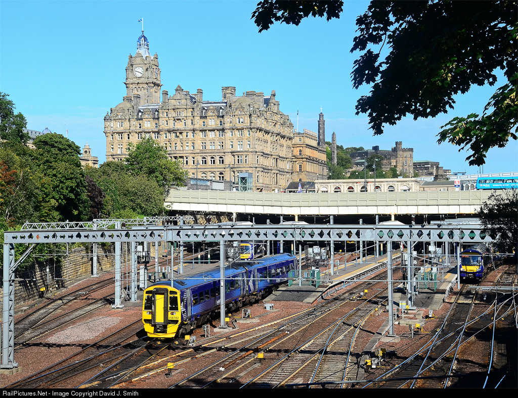 | The 1902 built North British Hotel (now sadly known as The Balmoral) and Calton Hill,with the Nelson Monument,dominate the skyline at Edinburgh Waverley station,as a Scotrail service arrives on a glorious September afternoon. |