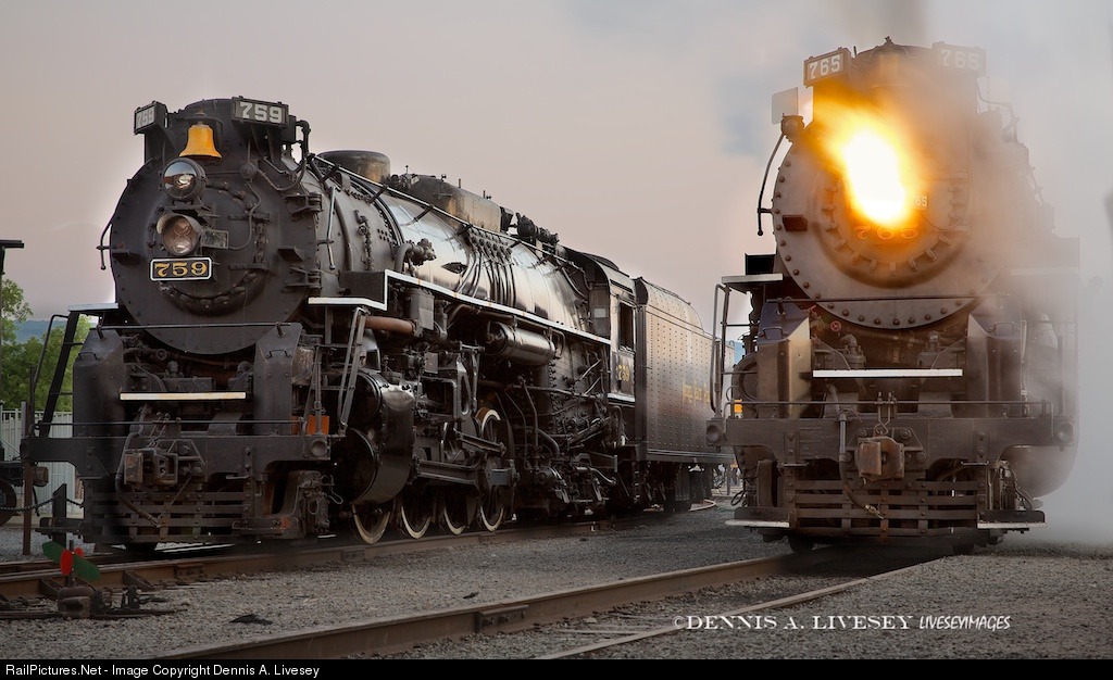 They were both built at Lima Locomotive in Lima, Ohio in 1944 and were two of a total of 80 Berkshires the NKP eventually acquired for it's famous fast freight service. As they were in the second group ordered, they are members of the S-2 class. No. 759 lays claim as the last steam locomotive out-shopped by the railroads main shops in Conneaut, Ohio in May 1958. As it was never put back into railroad service, this made it a prime candidate for it's second career as an excursion engine. After purchase by Steamtown's Nelson Blount and under the auspices of impresario Ross Rowland, the locomotive was used in a series of famous trips from 1968 to 1973 when it was returned to Steamtown. No. 765 was first plinthed in Fort Wayne then in 1979 became the first all-volunteer restoration of a steam locomotive to excursion service.
