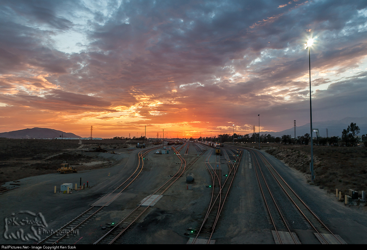 A view down the tracks of the departure yard at West Colton just after the sun set.