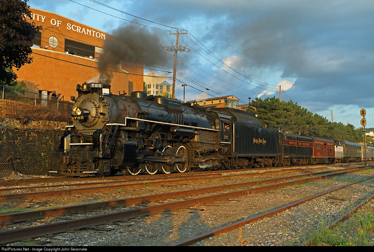 | The NKP 765 excursion from Steamtown to the Delaware Water Gap passes the University of Scranton on it's return to Scranton. At 6:55pm, the train catches some nice low light at the end of a beautiful late Summer day. |
