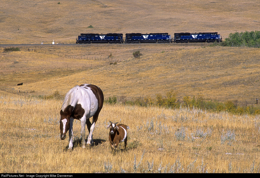 Little buddy While a horse and his little goat buddy seem more interested in the photographer, in the background, a Montana Rail Link helper set of three EMD SD70ACes drifts down the 2.2% grade into Austin, Montana, after helping a westbound train up Mullan Pass on September 25, 2006.