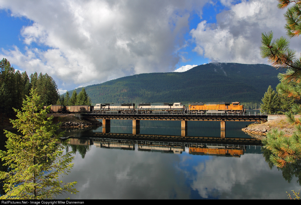 Crossing a small inlet along the Clark Fork at Tuscor, Montana, is a westbound BNSF coal train led by three EMD SD70MACs on September 26, 2014.