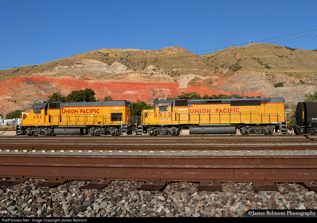 | After spending most of the summer working in local service out of Helper Yard, UP GP40P-2 No. 1373 finds itself assigned to an RCL switch job at North Yard in Salt Lake City. The 1373 is from a class of three production commuter rail units built by EMD for the Southern Pacific in 1974. |