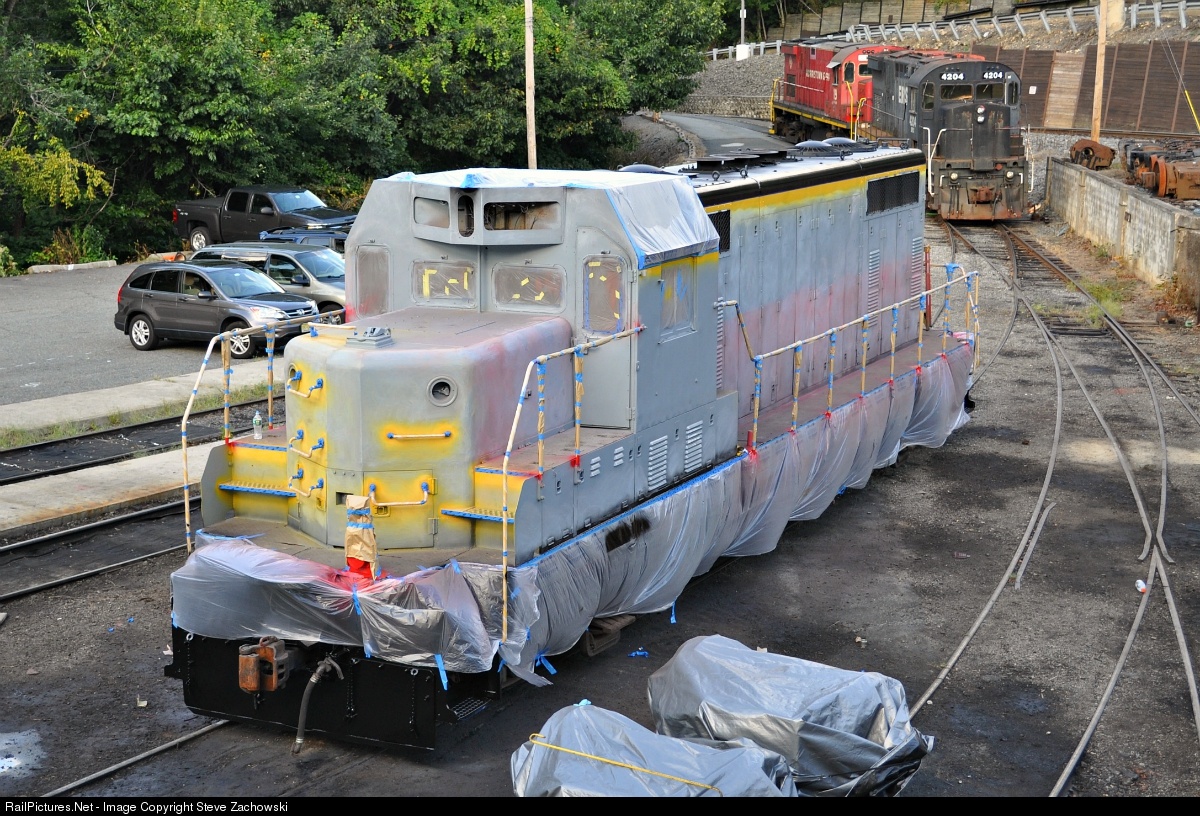 After spending the afternoon sanding ME 23, the locomotive only has a few spots remaining to be masked before being painted into Morristown & Erie's corporate scheme. Painting began after sundown and continued through the morning to ensure the locomotive will be ready for next weekends open house at the URHS restoration facility. The United Railroad Historical society will be hosting its 4th annual open house and will feature ME 23 making its first public appearance in its new paint scheme.