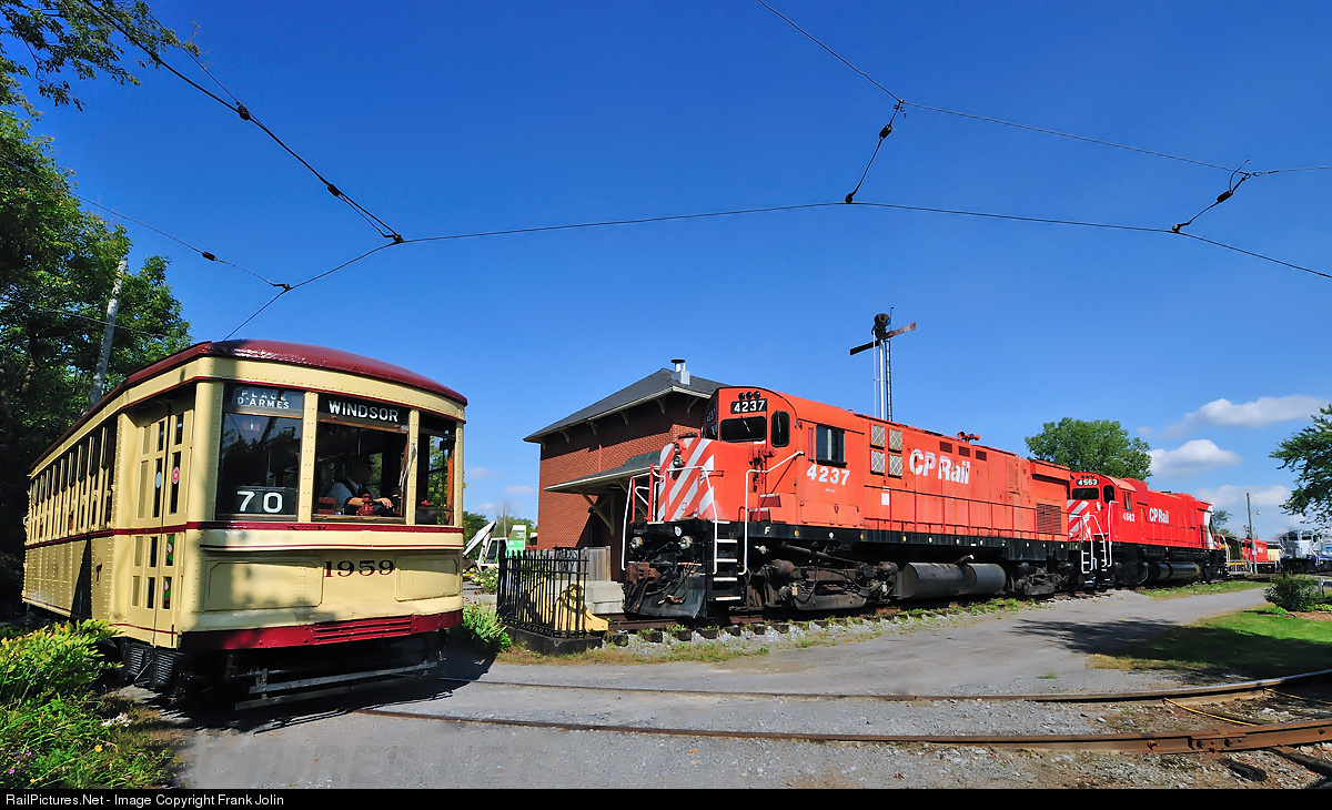 At the Canadian Railway Museum in St Constant Qc, Canadian Pacific MLW's C-424 4237 and M630 4563 pose at Hays station as Montreal Transport Commission street car 1959 departs.