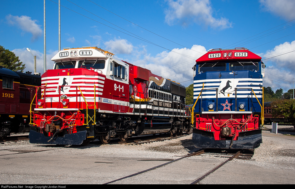 | A day after the 14th anniversary of the September 11th, 2001 terrorist attacks, two of Norfolk Southern's specially painted SD60Es honoring first responders and veterans pose together again for Railfest at the Tennessee Valley Railroad Museum. The two had been paired together across from the National Cemetary in July following the shootings of 5 military service members. |