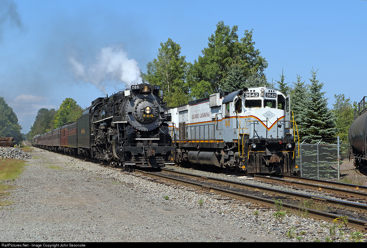 | The NKP 765 excursion from Steamtown to the Delaware Water Gap rolls EB on the former DL&W main, passing two 6 axle Alco Centuries. These units are serving as the protect power for the excursion. The DL 3642 was built in 1968 as Penn Central 6342 and became Conrail 6792. |