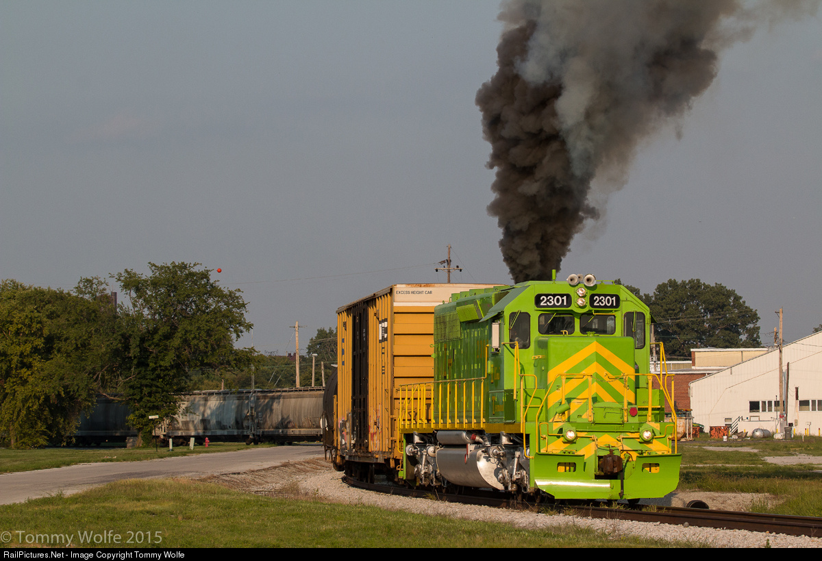 A lone SD40-2 in an Illinois Terminal inspired paint scheme blows carbon into the air as it shoves 39 cars (38 Loads one Empty) back into the yard for transfer to the TRRA. RRC 2301 started life as CNW 6923 in February of 1975. Then turned UP 3086 then was sold to the Respondek Railroad Corporation where it is working now.