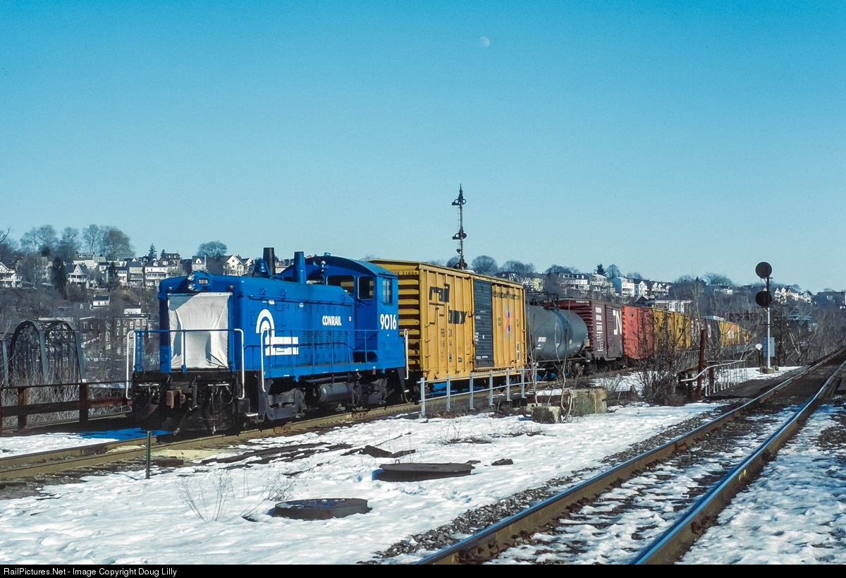 At the time of this photo, the least-used of the three railroad bridges spanning the Delaware River between Phillipsburg, NJ and Easton, PA was the former Jersey Central crossing. Here an SW9 brings a local across that span, with the former L&HR bridge seen on the left, and the former Lehigh Valley main line on the right. That would change within a few years, when structural issues with the LV bridge would precipitate a relocation of Conrail's Lehigh Line to the CNJ bridge. The bones of the CNJ semaphores are still in place at this late date.