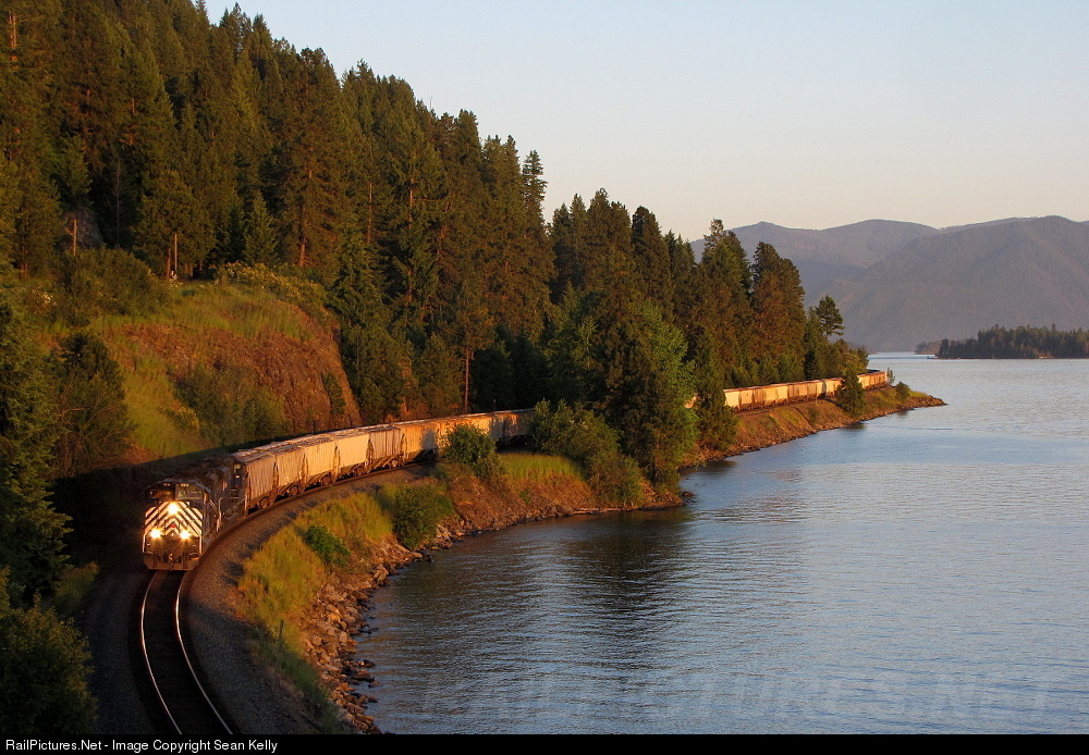 | A rare sight: MRL SD70ACe's in Idaho! Despite Montana Rail Link's mainline extending nearly 40 miles into Idaho and then crews running another 50+ miles over BNSF trackage to Washington, it is very rare to see MRL power in Idaho, especially now that blue SD45's are no longer on the road freights going to Spokane and Pasco. Thus we were very pleased to get the chance to chase a MRL-powered unit talc train all the way across the 4th Subdivision to this final shot along Lake Pend Oreille. By the time the end of the train rolled past, the sun had dropped below the mountains to the west. |