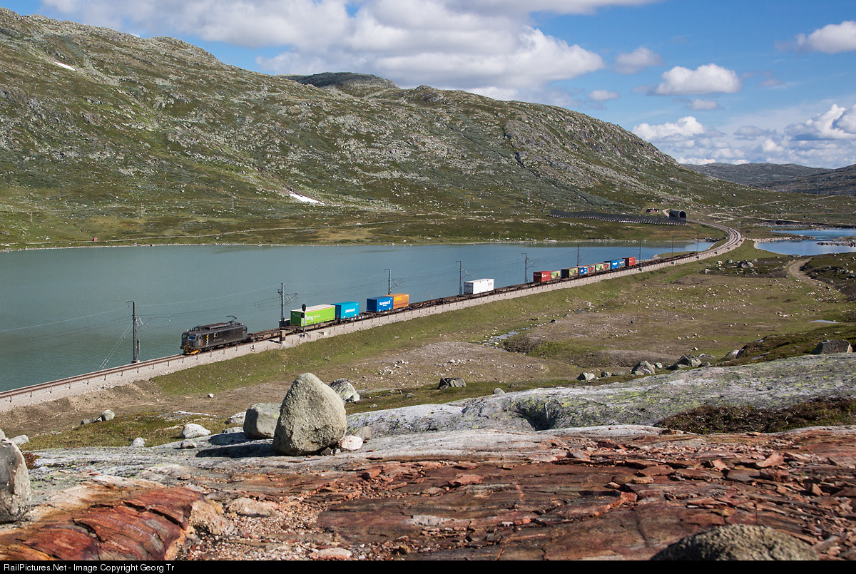 | 5082 kW sixaxle locomotive El 14 # 2173 of CargoNet A/S (55 % NSB, 45 % Green Cargo) with container train 5505 from Oslo Alnabru to Bergen, on the Bergen railway between Tunga and Finse, about 1130 meter a.s.l., with Hestebotn Lake in the background. 31 of this El 14 type were built by Thunes Mekaniske Værksted A/S between 1968 and 1973. They are still very popular with the engineers on the Bergen line because of their outstanding traction power compared with a 4 axle locomotive. |