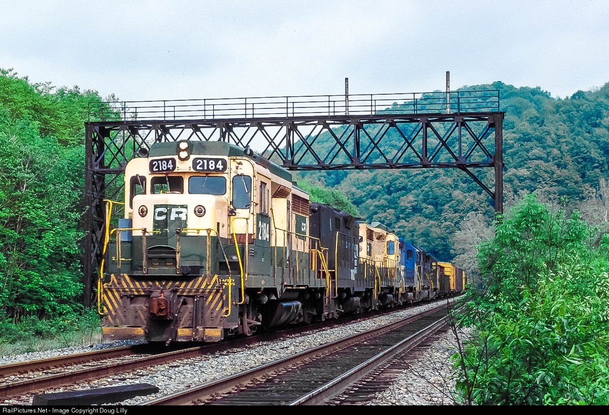 Approaching the settlement of Steel City, a westbound Conrail freight with an all-EMD consist that includes two ex-Reading GP30’s and a GP9B trundles under an abandoned signal bridge. I remember that the signals were semaphores, and they were there in the early 1970’s, but I don’t know when they were finally removed. The land across the road from this location has been the home of the Freemansburg motorcycle hill climb since the 1930’s.