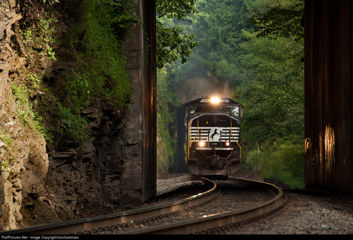 | NS 165 makes it's way over the old Southern Railway loops from Old Fort, NC to Ridgecrest, NC on the S-line. Seen here exiting Lick Log Tunnel just before going through McElroy Tunnel.