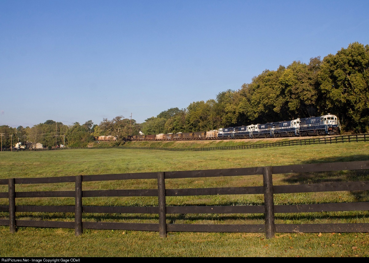 A set of 5 TTI B36-7s lead a loaded 60 car rock train around a small local farm in Paris as they head for Maysville