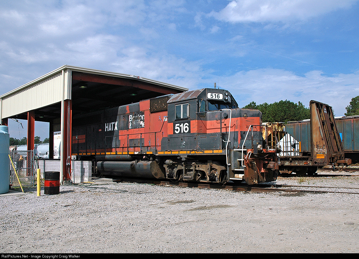 South Carolina Central's facility in Floyd, South Carolina, is typical of many shortlines - an open-air enginehouse, a few tracks for car repair and a small yard for making up locals. Spotted in their facility on October 17th, 2008, was leased Helm Leasing GP40-2 516. Built in December 1977 as Boston & Maine 312. It eventually sold to U.S. Rail Corporation, who resold it to HATX (as their 516). After this photo was taken, HATX repainted and renumbered this engine to HATX 4275. Photographed on railroad property with permission and full PPE.