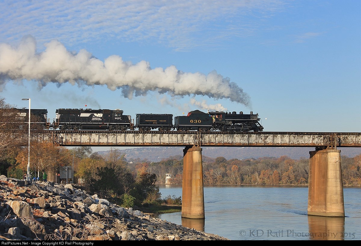 On a cool crisp November morning NS 060 (Chattanooga,TN-Onieda,TN) make a head start run across the Tennessee River (MP-331.3 (CP) Tenbridge) on its way north for Onieda, Tennessee. This special move is part of the NS 21st Century Steam Program, and is being led by restored Southern Rwy 630. At that time this was the second time since the early to mid 90s that steam has cross over Tenbridge, and what a sight it was to see during the peak of the fall season.