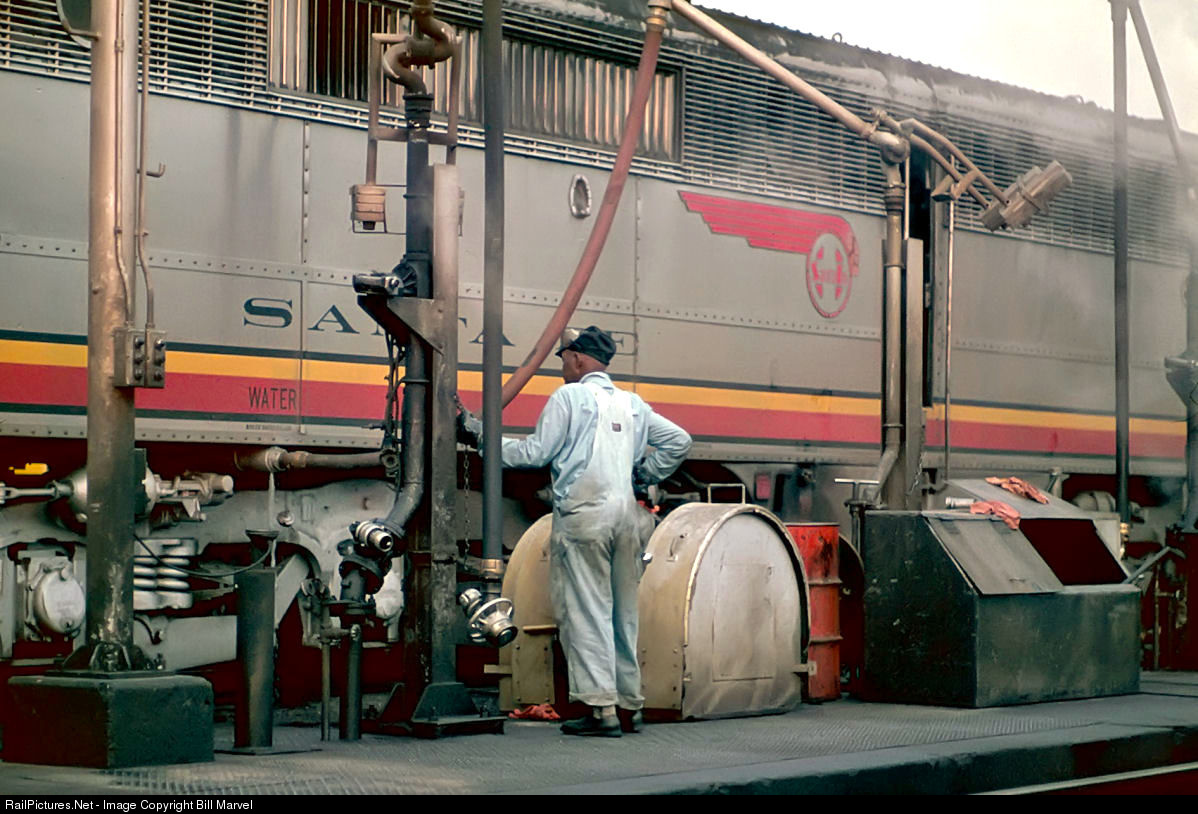 Water, fuel, sand –- essential to keep the wheels rolling. Here on an October evening one of a handful of workers at the Argentine engine terminal service rack supplies water to a Santa Fe PA-1 probably being readied for evening departure on the San Francisco Chief. By 1965, train 1 (westbound) and its eastbound counterpart and the Fast Mail Express are some of the last Santa Fe passenger runs still assigned to the big Alcos.