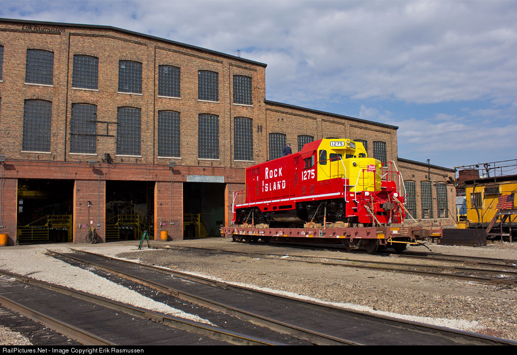 Sitting on a BNSF flatcar on the east side of the former Rock Island shop, the Eldon (IA) Depot Museum's re-incarnated Rock Island GP7 1275 is receiving some last minute work to lower the exhaust stacks even with the cab roofline. It will ride the flatcar to Agency, IA were it will be trucked to the depot at Eldon, IA for display. ** Taken with permission from NRE with an escort **