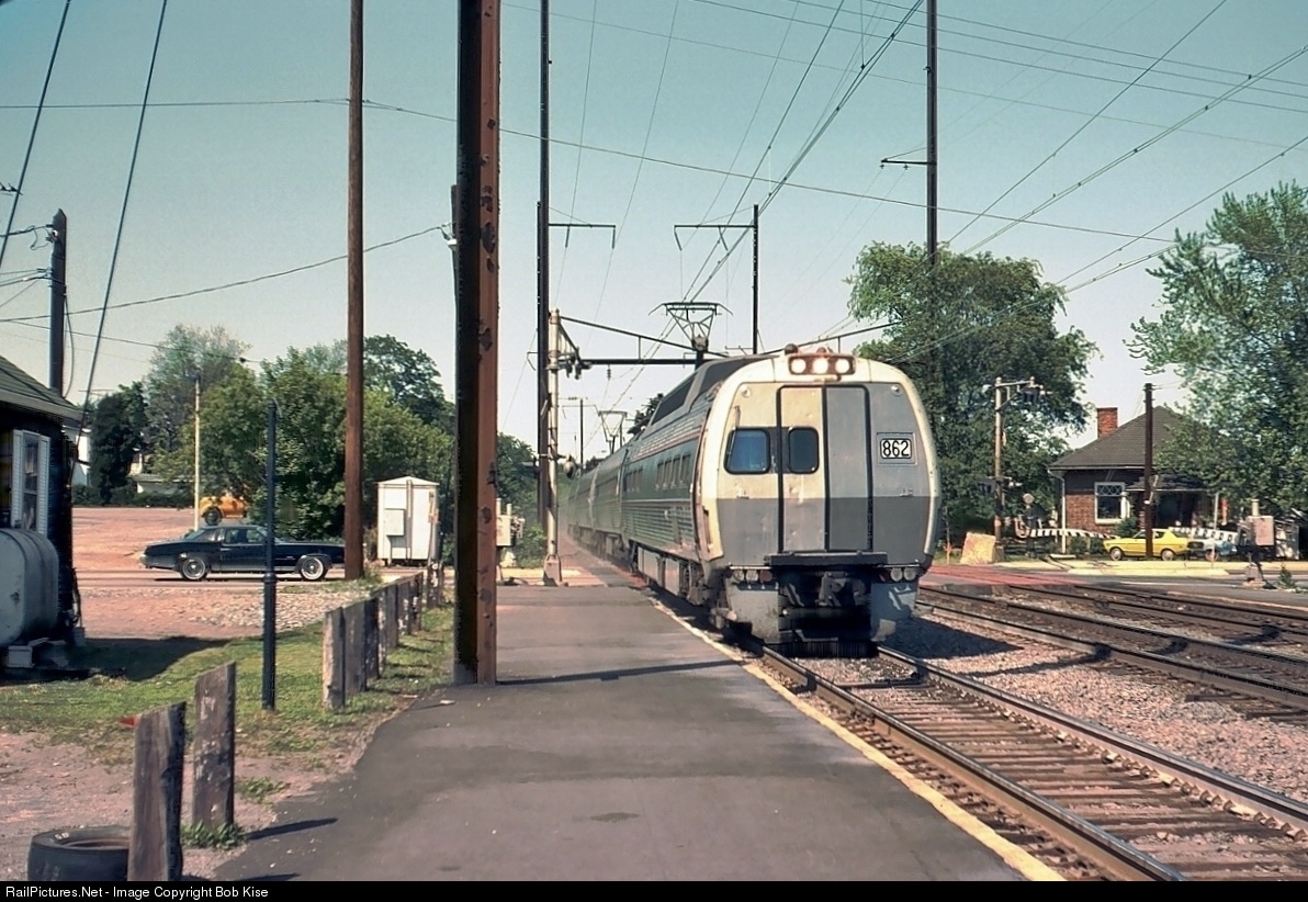 A GE-equipped car, not yet repainted but rebuilt with equipment moved to the roof, is southbound at Bel Air Avenue. The Metroliners had a shrill 2-chime horn, which really got your attention. Unmodified car 860 is preserved at the Railroad Museum of PA in Strasburg.
