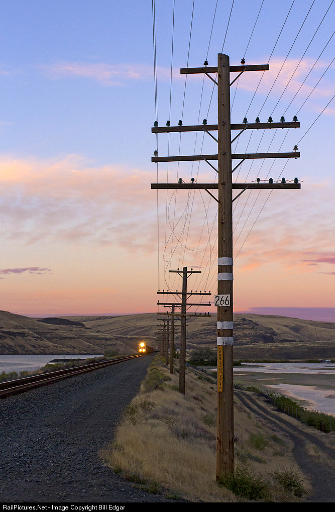 BNSF 1434 switches at the west end of Ayer yard at sunset along the Snake River. The train makes a turn from Pasco, WA to Ayer to interchange traffic with WATCO's Great Northwest Railway which handles business to/from Lewiston, ID and former Camas Prairie Railroad trackage. BNSF exercises trackage rights on UP to reach Ayer, thus the UP poles and mile post.