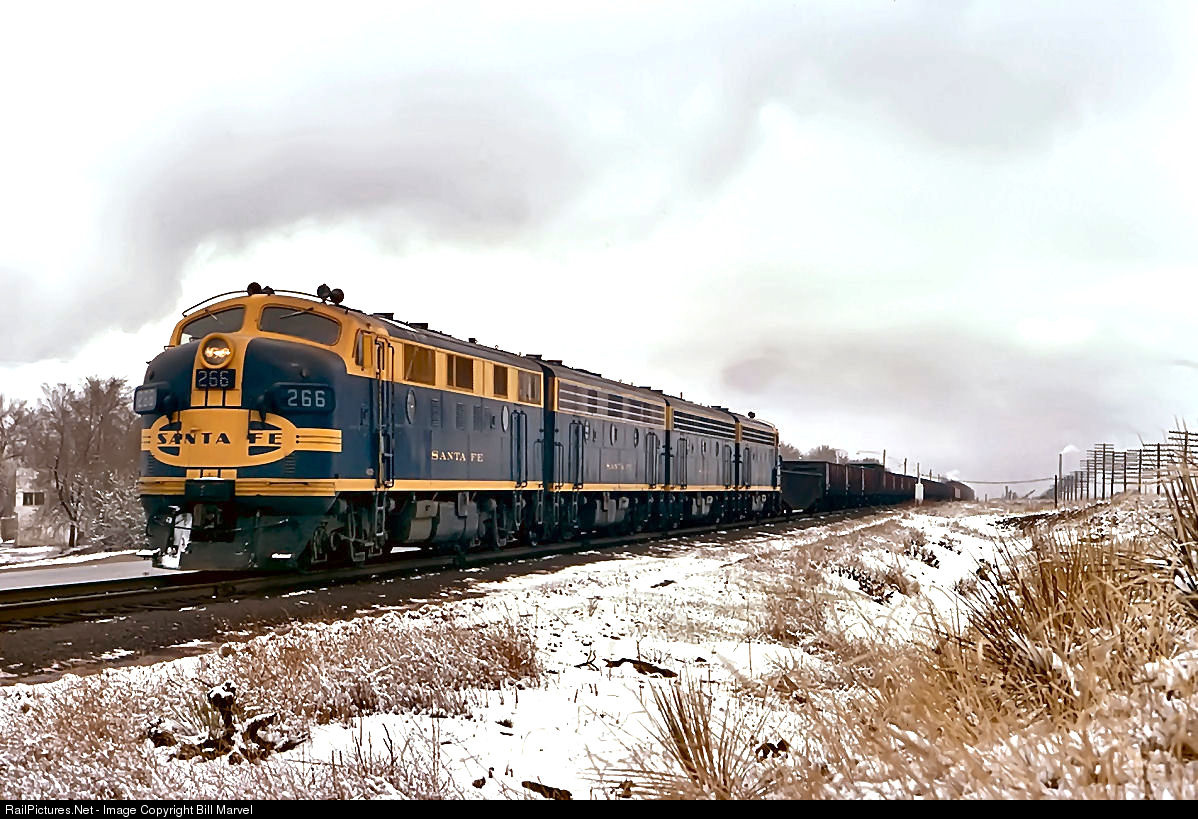 A light but wet April storm has set in along the front range south of Denver as Santa Fe F7A 266 and three sisters set out for La Junta, running along South Santa Fe Drive, a railfan favorite for pacing and quick action shots. The string of gondolas carry scrap metal for Pueblo, where much of it will be transformed into rail by Colorado Fuel & Iron works, the only rail-rolling mill in the West.U nlike the other three units, the 266 was delivered (in late 1951) with a “chicken-wire” mesh-style grill rather than the more elegant stainless steel. In late 1972 it will be rebuilt in the road’s Cleburne, Texas, shops into a CF7road switcher and will end its career in 1984 after 33 years of service.