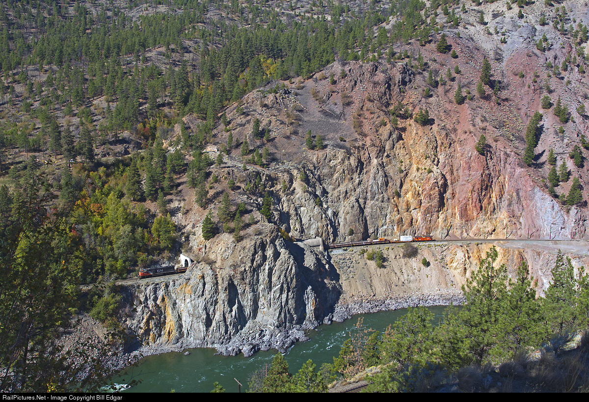 A Canadian National work train consisting of mostly Difco type dump cars returns west through a tunnel just east of Lasha siding along the Fraser River. This train spends each day working on slide area debris removal loading the train then backing it to Spences Bridge to unload. This sometimes causes delays to westbound CN and CP freights using the CN line for westbound moves.