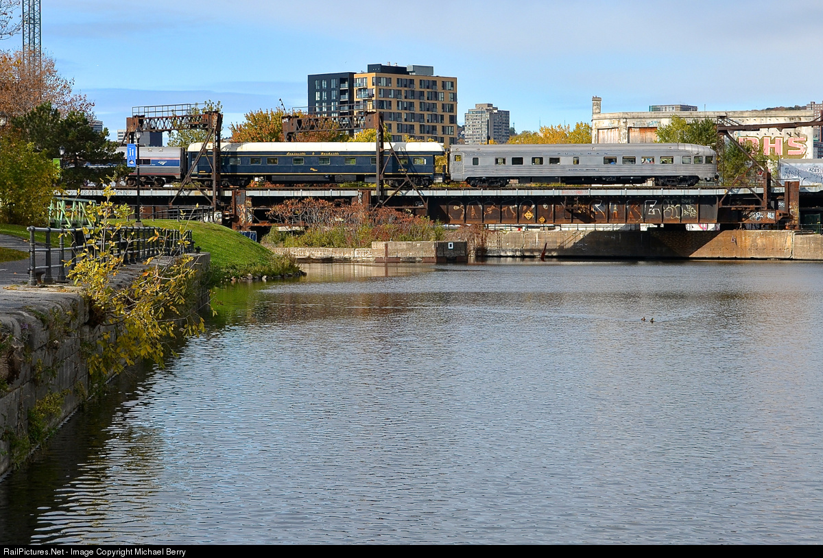 Not one, but two private cars bringing up the rear. The southbound Adirondack has just left Montreal's Central station, and is crossing over the Lachine canal with two private cars: Ohio River and Babbling Brook bringing up the rear as they pass the closed Wellington tower. Built by Budd for the New York Central's Boston-Chicago New England States, the Babbling Brook has a Canadian connection as CP bought it from NYC in 1959 and they sold it to Quebec Cartier Mining Company in 1969.