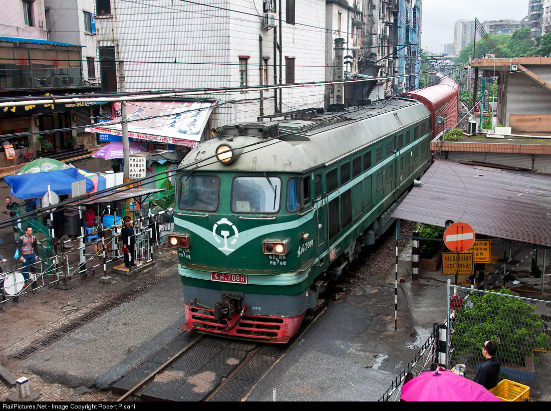 Guangzhou is a very crowded city. This pedestrian crossing, which I found while walking in the area of the main Guangzhou Railway Station, provides a good example. A DF4-led train of auto racks is on a connecting track between the non-electrified Guangmao Line and the electrified Guangshen Line, heading east toward Shenzhen. This crossing is located in a tight space between an overpass and a row of buildings which closely line the right of way. It is guarded by familiar-looking flashing red lights and crossbucks (not visible) and is also manned by employees who raise and lower gates well before a train approaches. One guard can be seen immediately the left of the locomotive. It is a fascinating operation to watch!