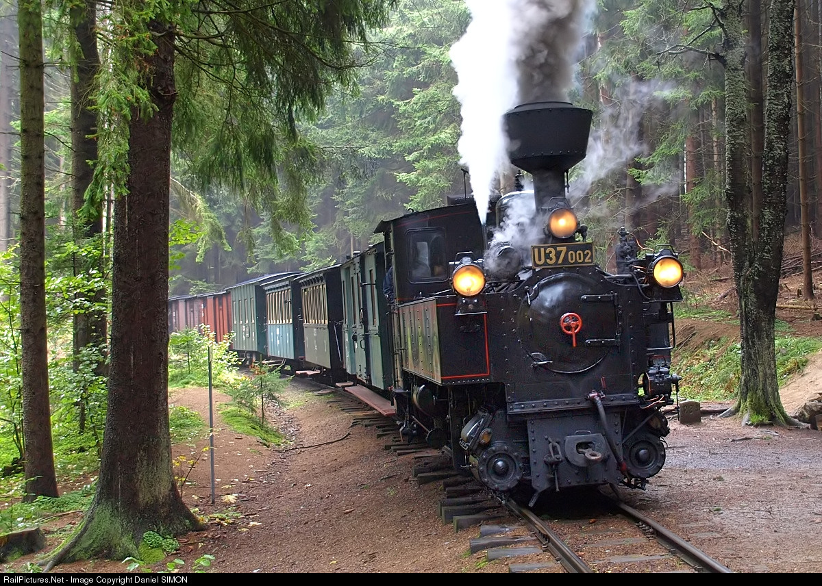 | The 760mm gauge 0-6-2T U37.002 was built by Krauss Linz in 1898, originally as a Austrian class U. Restored in 2004, she is now hauling charter trains on the JHMD. The passenger train is seen here making a brief stop at the Kaproun station. |