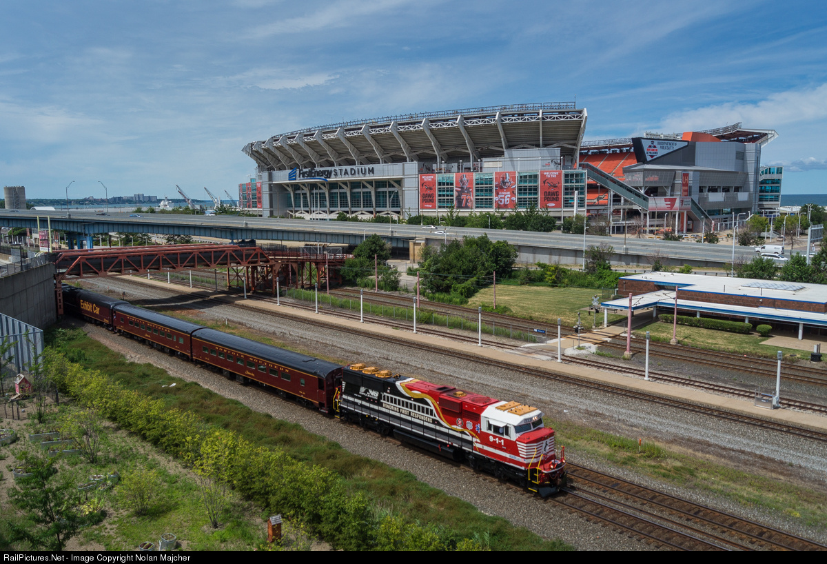 | On a beautiful day along the shores of Lake Erie, Norfolk Southern's Honoring First Responders Unit leads the Operation Lifesaver Whistle Stop Safety Train Eastbound past the First Energy Stadium and the Amtrak Station at Cleveland, Ohio as it rolls East toward it's destination of Alliance, Ohio. |