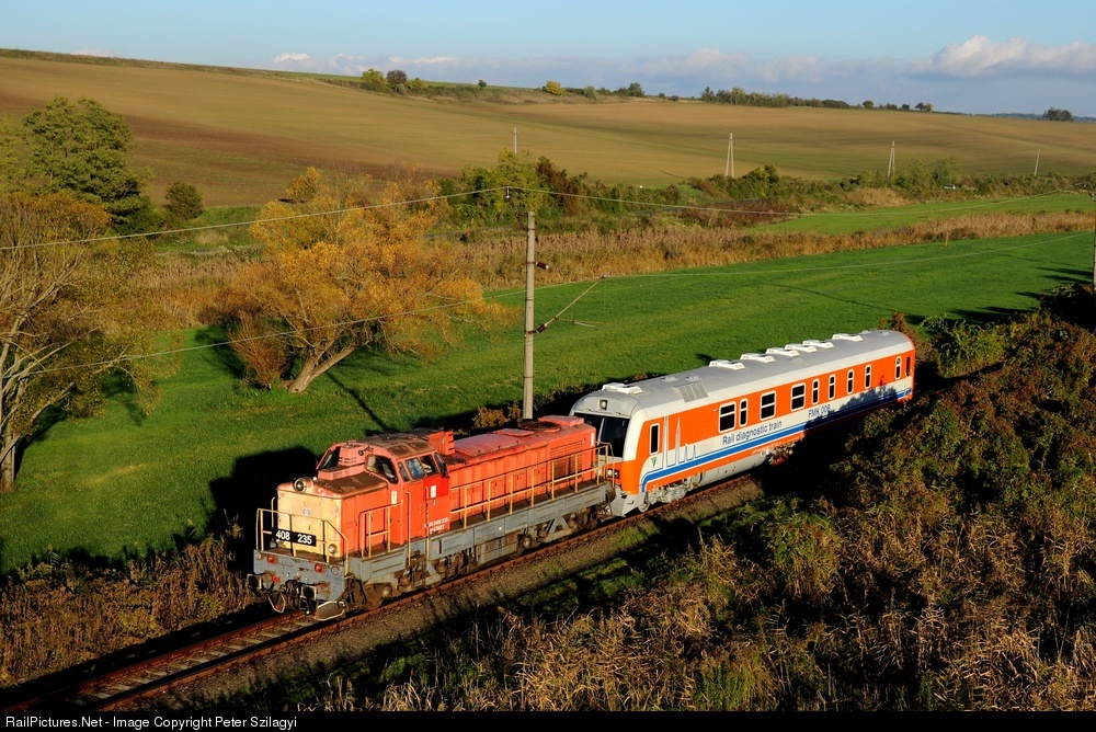 Test run of the new hungarian FMK 008 rail diagnostic wagon with an old 408 locomotive.