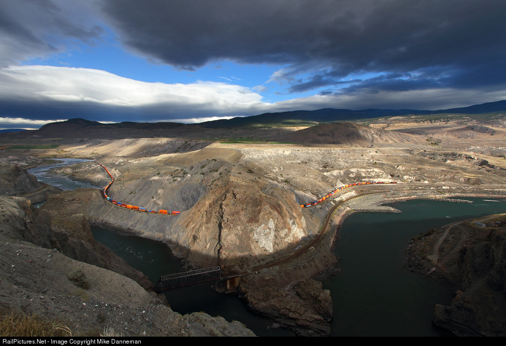 Late afternoon wind and clouds swirl over Black Canyon west of Ashcroft, British Columbia, on September 24, 2015, as a colorful westbound Canadian Pacific intermodal train threads the depths of the canyon along the Thompson River.