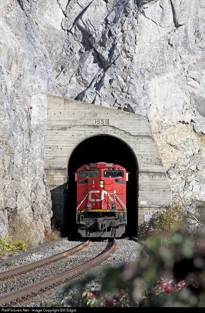 CN 8849 exits tunnel 67.6, the second of two tunnels in a row. The tunnel is located along the Thompson River just east of Martel siding, several miles east of Spences Bridge, BC.
