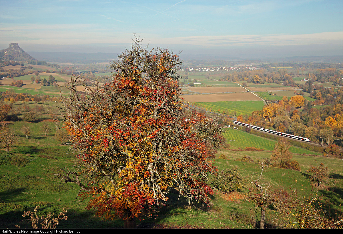 | At a late fall day, two RABe 526 are running Engen – Konstanz. On this line, the regional trains are named "Seehas" ("lake hare"). |