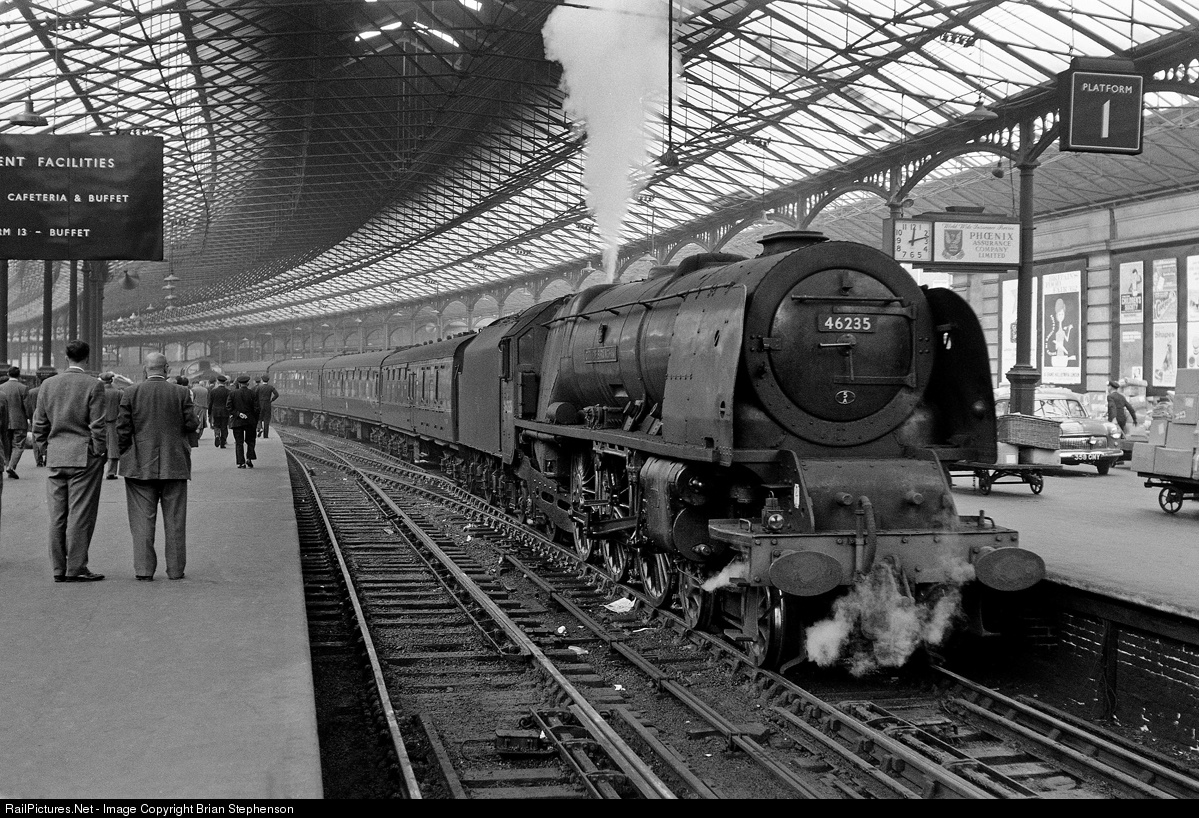 Princess Coronation class Pacific No 46235 City of Birmingham is seen at London's Euston station after arrival with the 8am express from Manchester Piccadilly. Originally streamlined, this engine has been preserved in the City it is named after since its withdrawal from service in September 1964. Note the people awaiting the English Electric Type 4 diesel approaching on the adjacent platform,