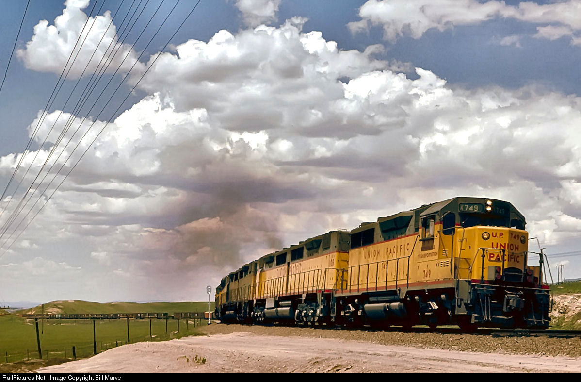 In 1963 EMD fielded a four-unit set of demonstrators – two of the new 2,500-hp GP35s bracketing a pair of its 5,000-hp twin-diesel DD35s. UP, which had already committed itself to the cabless DD’s, liked the combination as a replacement for its Big Blow turbines, and bought two dozen of the geeps and 27 of the DD’s, and, in 1964 started running sets on fast freights over the Omaha-Los Angeles route. Here, on a gorgeous summer day in 1965, such a combination behnd GP35 749 storms Archer Hill east out of Cheyenne. Already on the erecting floor at EMD: 15 of the double diesels with cabs, the new DD35A model.