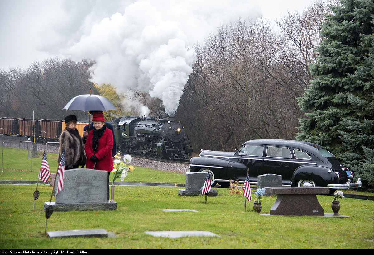Soo Line 2-8-2 #1003 passes the cemetery at St. John's Catholic Church in Rubicon on a photo charter operated by Historic Transportation Preservation, Inc. (Steam Specials). The automobile is a 1947 DeSoto limousine.